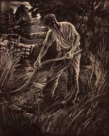 Local examples of his work may be seen in the church at Kirkby Malham, where there is a wonderful stainless steel kingfisher, a Christmas Crib made from carved wood, the font cover in wood and wrought iron and cards showing reproductions of some of his wood engravings, on sale to raise money for the church.