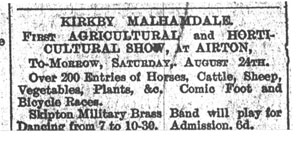 The Fifth Annual Exhibition of the Malhamdale Agricultural and Horticultural Society was held on Saturday August 19th 1911. The catalogue detailed 147 classes including an extensive poultry section, missing from the modern show, and even a class for your Aspidistra!