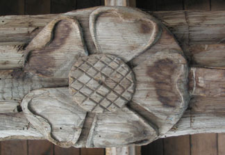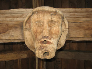 It is assumed that the reason for our pulley was to raise or lower this cover over the Great Rood, a function it would still be capable of today, if there was one. The head is a fine piece of medieval woodwork, though perhaps "cleaned up" by the Victorians, and is held in position on the roof beam by a mortice and tenon joint and a wooden peg, and the small amount of colour on the lips shows that it was once painted.