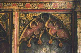 Medieval wall paintings were not the only decoration that would have been seen, roof timbers and ceilings were often painted too and remains of colour can still be seen on some roof timbers at Kirkby Malham. Other churches are more fortunate and still have larger examples of mediaeval decoration, such as this portion of a chancel screen in a Norfolk church.